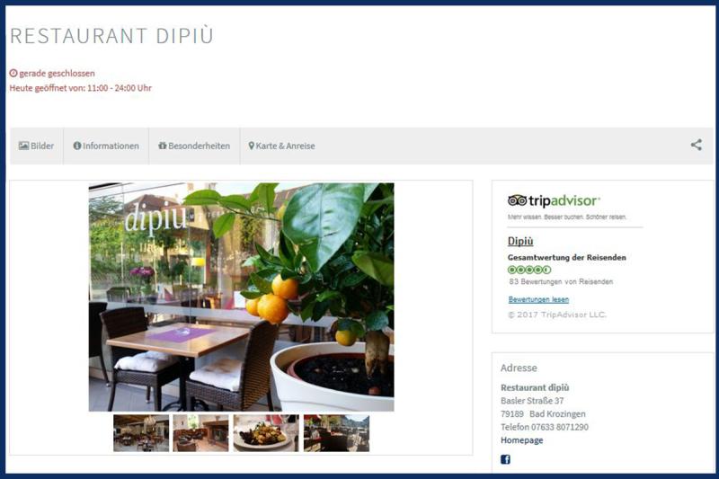 Der Gast erhält auf einen Blick die wichtigsten Informationen: Aktuelle Öffnungszeiten, Impressionen, besondere Angebote, Adressdaten und Kontaktmöglichkeiten. Die einzelnen Einträge der Gastronomen sind ansprechend und modern gestaltet, außerdem passen sie sich, ebenso wie die gesamte Homepage der Kur und Bäder GmbH, an die Bildschirmgröße des Endgerätes an. So kann auch unterwegs bequem vom Smartphone oder Tablet die aktuelle Information abgerufen werden.