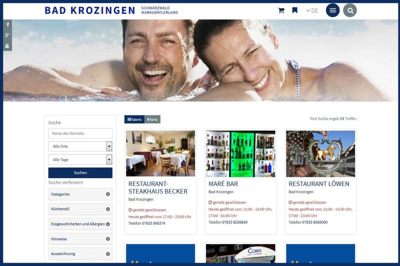 Das Gastronomieverzeichnis wurde als neues Modul auf der Homepage der Kur und Bäder GmbH integriert und stellt sowohl optisch, als auch technisch eine tolle Lösung dar. Übersichtlich werden alle Betriebe zunächst in einer Kachelebene dargestellt. Der Gast hat hierbei die Möglichkeit, die Betriebe nach beliebigen Kriterien wie z.B. Küchenstil zu filtern, um so das passende Angebot für sich zu finden. Auf diese Weise gelingt es, die gesamte Bandbreite von Betriebsarten unterzubringen und gerecht darzustellen.