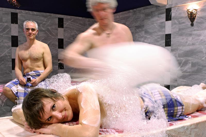 - Wassergüsse, Peeling, Ballonmassage, Einseifung mit Lavendelseife, Schaummassage, Ölmassage