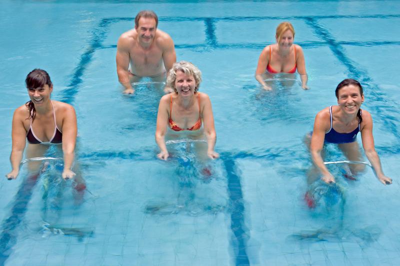 Dreimal pro Woche wird auf speziellen AquaCycling-Rädern im Wasser trainiert. Das kohlensäurereiche Mineral-Thermalwasser entlastet die Gelenke.